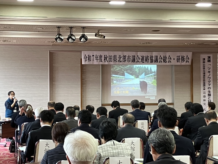 研修会では、秋田県生活環境部自然保護課の近藤麻実氏による「ツキノワグマの生態と対策」の演題での講演・研修会が実施されました。